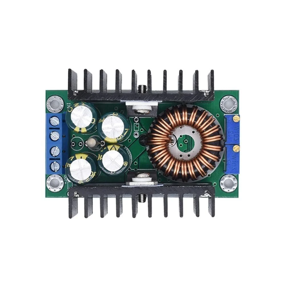 The 300W 10A DC-DC Step-down Buck Converter Adjustable Constant Voltage Module can be used to get adjustable output voltage ranges from 1.5V to 35V. The module provides a wide range of current output up to 10 A. With heat sink mounted it can easily manage to run high power application continuously (provided that for continuous high power output you need to use a cooling fan on the heat sink).