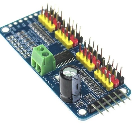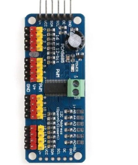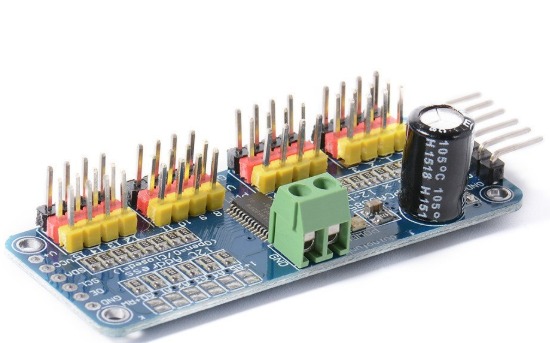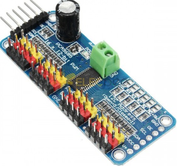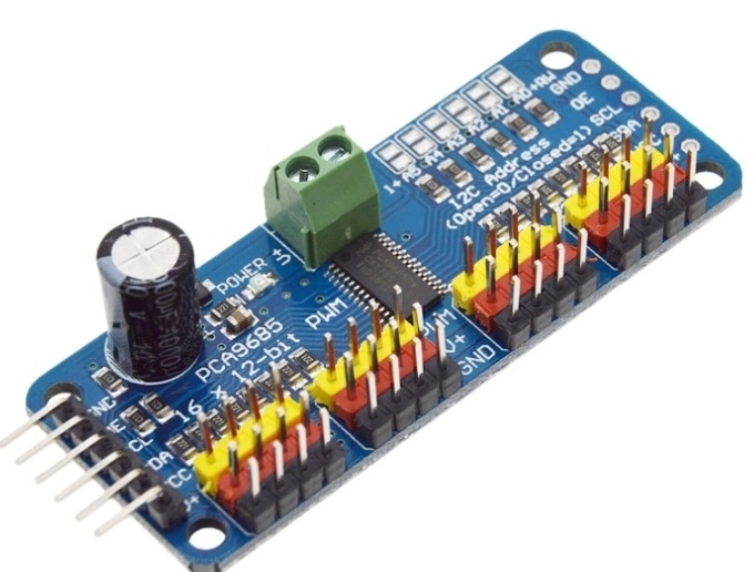 It’s an I2C-controlled PWM driver with a built-in clock. That means you do not need to continuously send it to signal to tie up your microcontroller, it is completely free running!