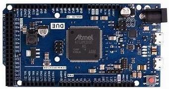 The Due is a microcontroller board based on the Atmel SAM3X8E ARM Cortex-M3 CPU. The Due Arduino AT91SAM3X8E ARM Cortex-M3 Board is the first Arduino board based on a 32-bit ARM core microcontroller. It has 54 digital input / output pins (of which 12 can be used as PWM outputs), 12 analog inputs, 4 UARTs (hardware serial ports), a 84 MHz clock, an USB OTG capable connection, 2 DAC (digital to analog), 2 TWI, a power jack, an SPI header, a JTAG header, a reset button and an erase button.
