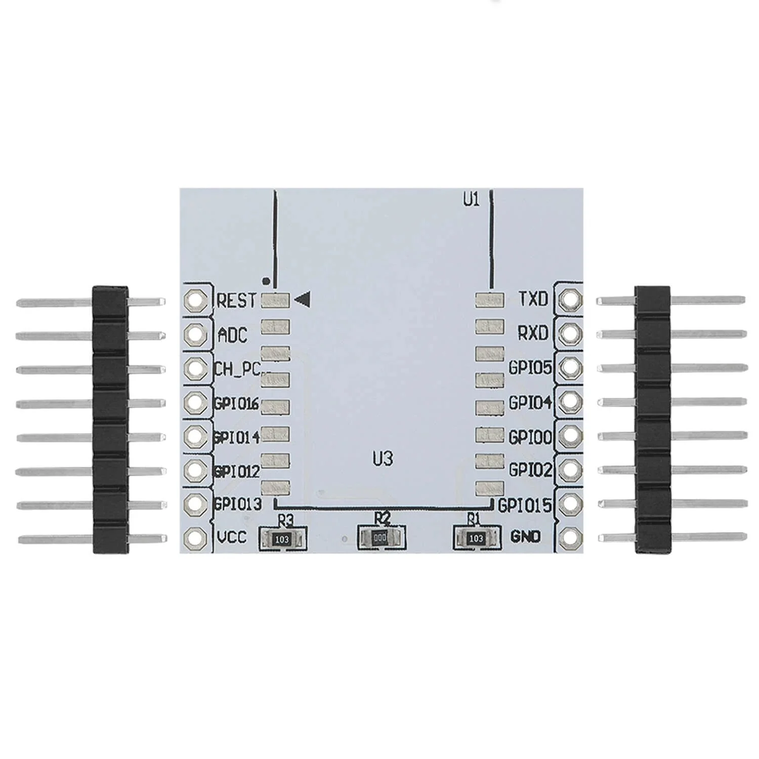 ESP8266 adapter plate compatible with the ESP07, ESP08, and ESP12. Because soldering the ESP modules is not always easy, this adapter plate is available. The WiFi module can be soldered to the PCB, wherein they are connected to connection points clearly indicated by headers.