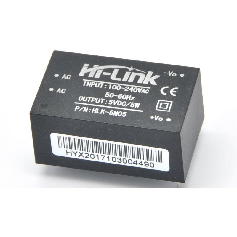 Hi-Link HLK 5M05 5V/5W Switch Power Supply Module is plastic enclosed PCB mounted isolated switching step-down power supply module. It can supply 5V DC from 120V AC – 230V AC and has a power rating of 5 Watt. This makes it perfect for small projects that need a 5 volt supply from mains. This power supply module replaces lots of parts from the traditional power supply like diodes, voltage regulator and transformers. Therefore there are many advantages for these modules, such as low-temperature rise, low power, high efficiency, high reliability, high-security isolation etc.